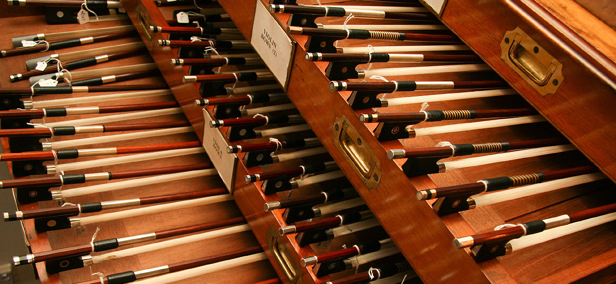 We commission new European bows from renowned English, German, French, Swiss and Belgian makers and we have some fine older English examples from the workshops of Messrs W. E. Hill and Sons. Choosing a bow is a highly personal matter. Subtle differences of weight and balance contribute to making a good partnership between player, instrument and bow.